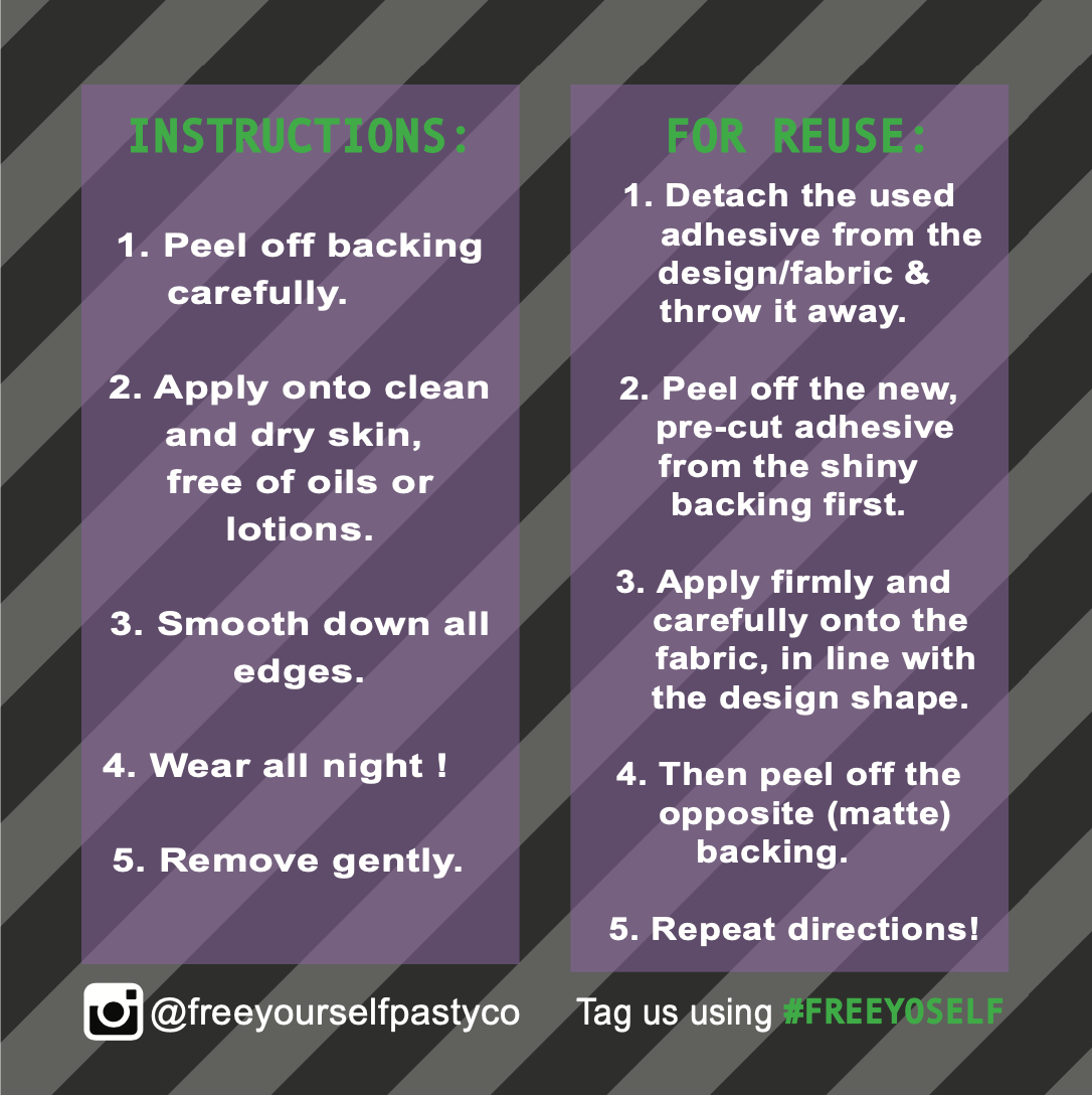 Simply purchase a pair of $5 adhesive sheets that match your design. Once received, apply the double sided adhesive onto the fabric, and then to your skin. (comes with instructions)