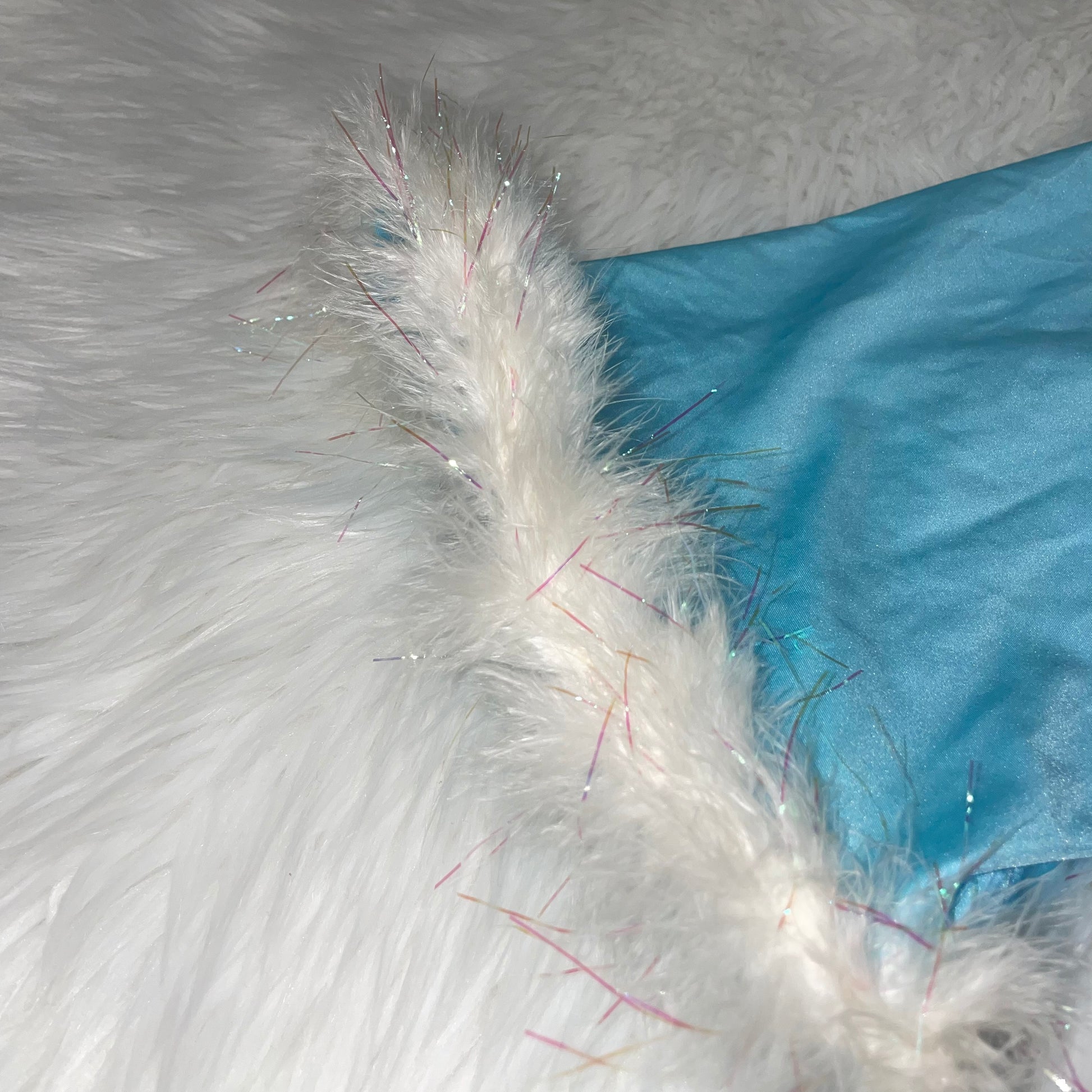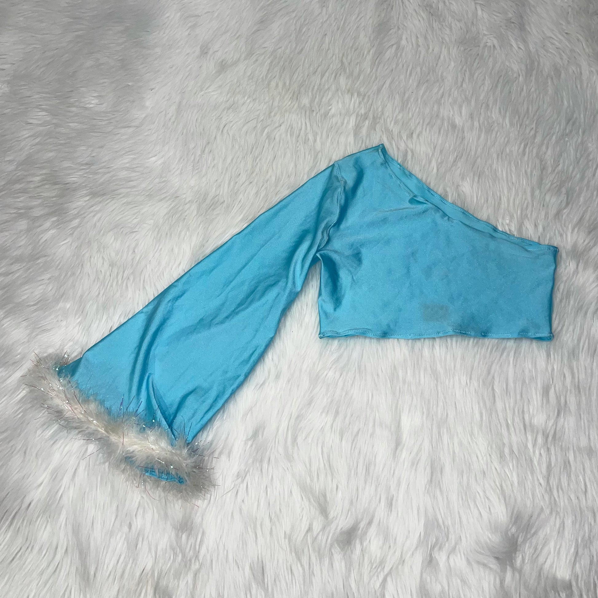 - One-shoulder cropped-top with a bell sleeve trimmed with white boa